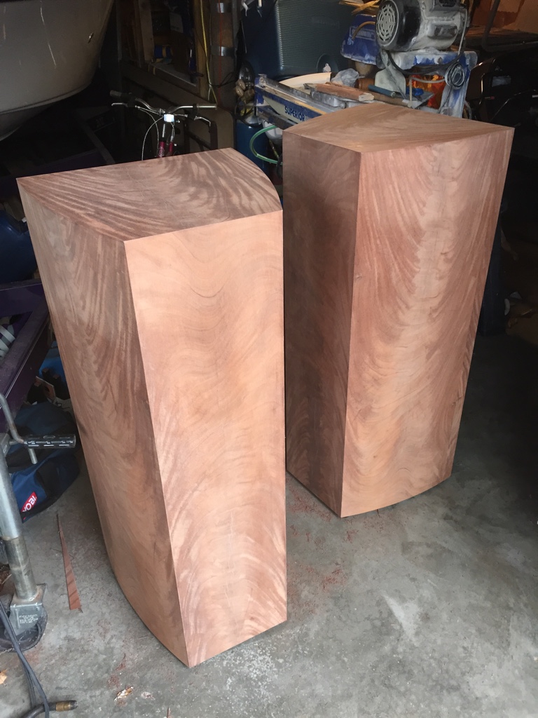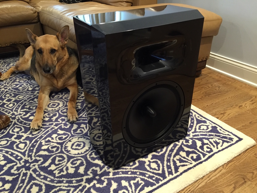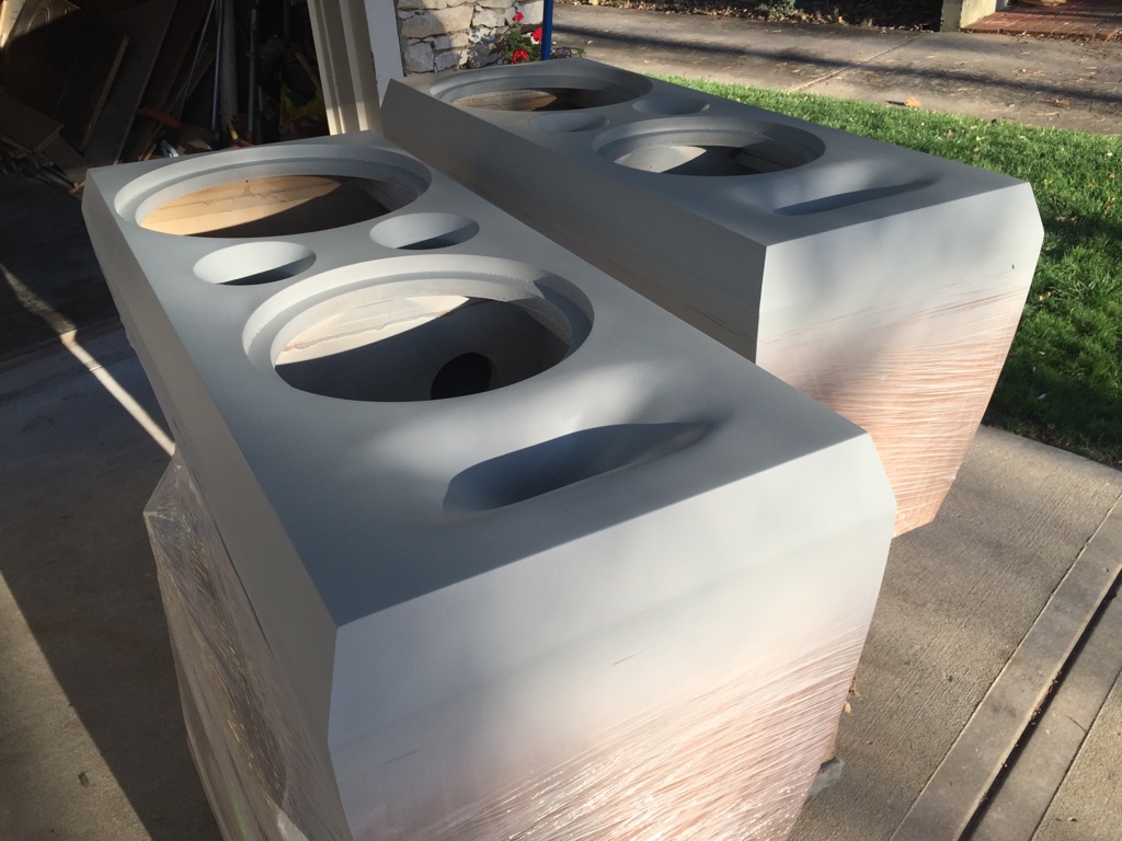 “The cabinets are built with MDF and covered with crotch mahogany veneer on the sides and top. The front is an automotive 2k metal flake base coat, and the entire cabinet is finished with 9 coats of 2k clear. The TD12M have a 1 cubic foot net cabinet tuned to 60hz with a separate sealed compartment for the LF driver of abound 3.3 cubes. The LF Diver is a Creative Sound Solutions SDX-15.”