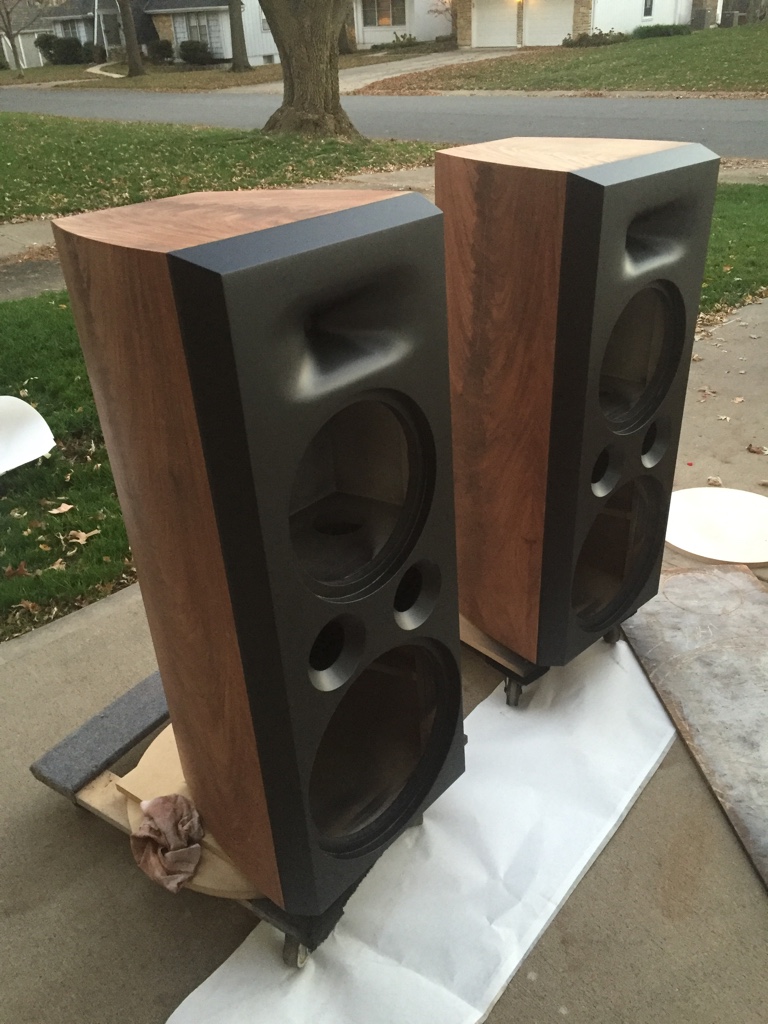 These beautiful 3-way DIY speakers featuring TD12M’s and SEOS12’s with DNA-360 compression drivers are finished in a crotch mahogany veneer with automotive 2k metallic flake paint on the front baffles. Here is what Doug had to say about them: